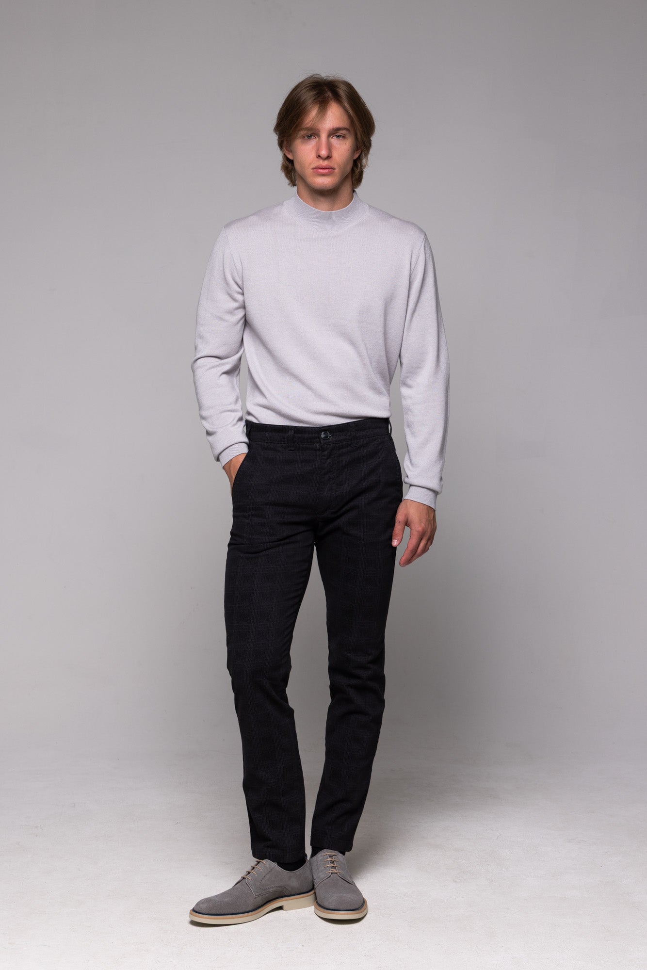 - Model je vysoký 187 cm a má oblečenú veľkosť 33/32.